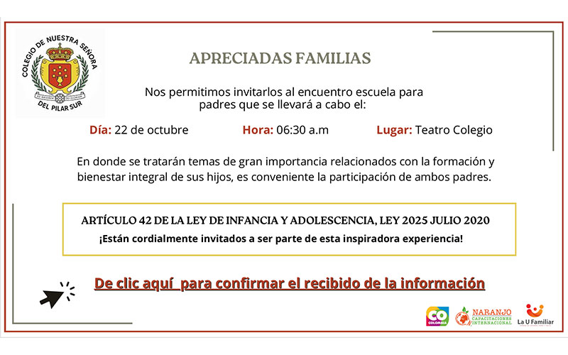 Nos permitimos invitarlos al encuentro escuela para padres que se llevará a cabo el día 22 de octubre a las 06:30 am en el Teatro Colegio, En donde se tratar...